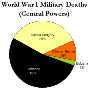 An entire generation of young men were obliterated or maimed.  (These figures vary a great deal.)  The Allied losses totaled 5,520,000 killed in action and 12,831,500 wounded in action, a total of 18,356,500 casualties; the Central Powers saw 4,386,000 killed and 8,388,000 wounded, a total of 12,774,000 casualties.  The big losers: Germany with 2,050,897 dead, Russian Empire 1,811,000, France 1,397,000, Austro-Hungarian Empire 1,200,000, British Empire 1,114,914; actually, as percentage of population the biggest losers were the Serbians at an astounding 17-28%, the Turks at 13-15% and the Romanians at 8-9%.  Add to all this 4,000,000 civilian deaths on the Allied side and 3,700,000 on the side of the Central Powers (including perhaps 1,500,000 Armenians).  In all, about 17,593,000 died in the Great War; millions more would die in the Russian Civil War and resulting famine in the Ukraine (not to mention a natural cause – the influenza pandemic).