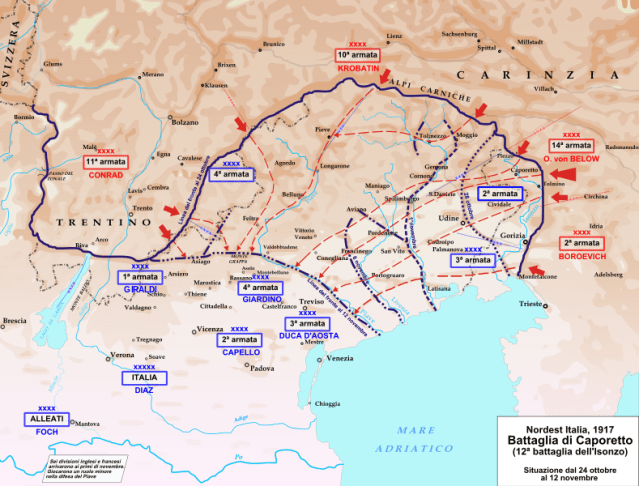 And the news we have all been waiting for: the Twelfth Battle of the Isonzo (Caporetto). By 2 November the Germans and Austrians had crossed the Tagliamento River, only 40 miles from Venice, but the inevitable supply problems associated with a successful advance began to slow things down, giving the Italians time to establish a line on the Piave River. Enemy forces reached the Piave on 11 November, but short of supplies and reinforcements they could not cross the river, nor could they in the next two weeks dislodge the Italians from Monte Grappa, which guarded the left flank of the Piave Line.