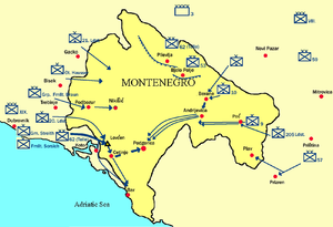 On 10 January the Austrians began nosing into Montenegro, leading to an armistice between the two powers two days later.  But Montenegro had helped the Serbs and in any case was important to Austria, being situated between the Empire and their new possession of Albania, and on 20 January the armistice ended.  The country fell to the Austrians, and King Nicola I fled to France and the Albanian government was ensconced in Bordeaux.