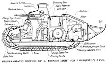 France’s third tank was by far the most successful. Renault, accustomed to mass production of cars, came up with a design for a light tank, the 7 ton Renault FT, which entered service in late 1917. This was in effect the first modern tank: the power plant was at the rear, and a fully rotating turret on top housed the armament, either a 37 mm gun or several machine guns. The design was very successful, and 3700 were produced – more than any other tank in the war – many finding employment in various countries until well after the Second World War.
